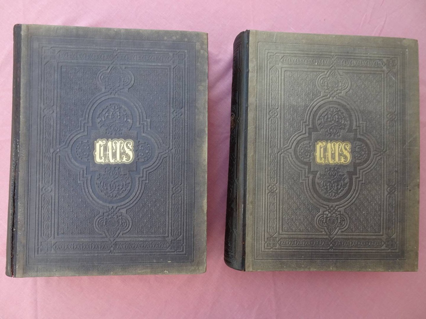 | Bijzonderheden: | 1862; Erven J.J. Tijl; ed. by J. van Vloten; more than 400 steelengravings by J.W. Kaiser; folio; halfleather, front- and back cover cloth, blind stamped ; 'Cats' gilt stamped; resp. [XX], XVI, 946, [20] and XVI, 898, [18] pp. |