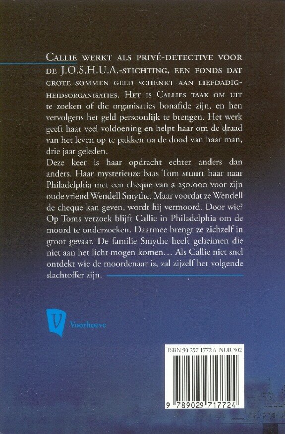 Deze keer is haar opdracht echter anders dan anders. Haar mysterieuze baas Tom stuurt haar naar Philadelphia met een cheque van $ 250.000 voor zijn oude vriend Wendell Smythe. Maar voordat ze Wendell de cheque kan geven, wordt hij vermoord. Door wie? Op Toms verzoek blijft Callie in Philadelphia om de moord te onderzoeken. Daarmee brengt ze zichzelf in groot gevaar. De familie Smythe heeft geheimen die niet aan het licht mogen komen... Als Callie niet snel ontdekt wie de moordenaar is, zal zijzelf het volgende slachtoffer zijn. |