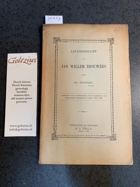 Levensbericht van Jan Willem Brouwers. Leiden, E.J. Brill, 1898, 35pp. original paper binding. With bibliography. Brouwers was a clergyman in Bovenkerk. Johannes Wilhelmus (Jan Willem) Brouwers (Margraten, 1 January 1831 - Maastricht, 3 March 1893) was a Dutch roman-catholic priest and author. From 1854 to 1863 he was a teacher at Rolduc and from 1863 to 1872 chief aditor of dagblad De Tijd.