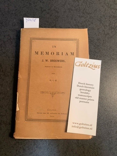 In memoriam J.W. Brouwers. Gulpen, M. Alberts en Zonen, 1899, 204p. with photographic portrait as frontispiece and poems by Brouwers, original paper binding. Binding suffering, block broken, spine gone, front loose. Brouwers was a clergyman in Bovenkerk. Johannes Wilhelmus (Jan Willem) Brouwers (Margraten, 1 January 1831 - Maastricht, 3 March 1893) was a Dutch roman-catholic priest and author. From 1854 to 1863 he was a teacher at Rolduc and from 1863 to 1872 chief aditor of dagblad De Tijd. Not in KB.