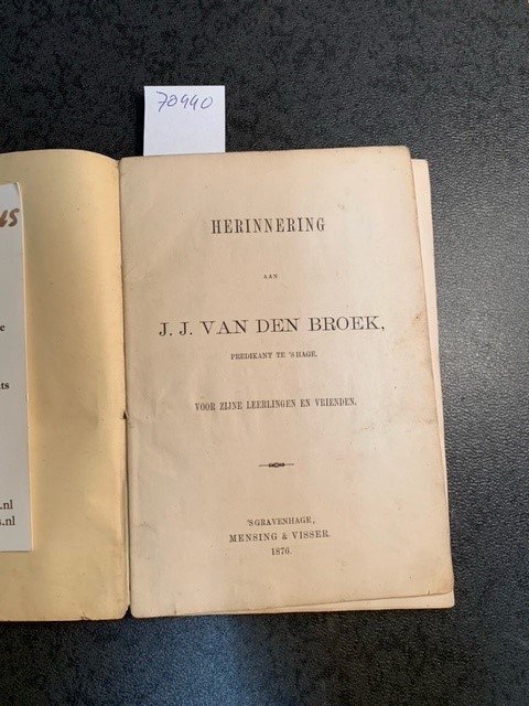 | Titel: | Herinnering aan J.J. van den Broek, predikant te 's hage. Voor zijne leerlingen en vrienden. |