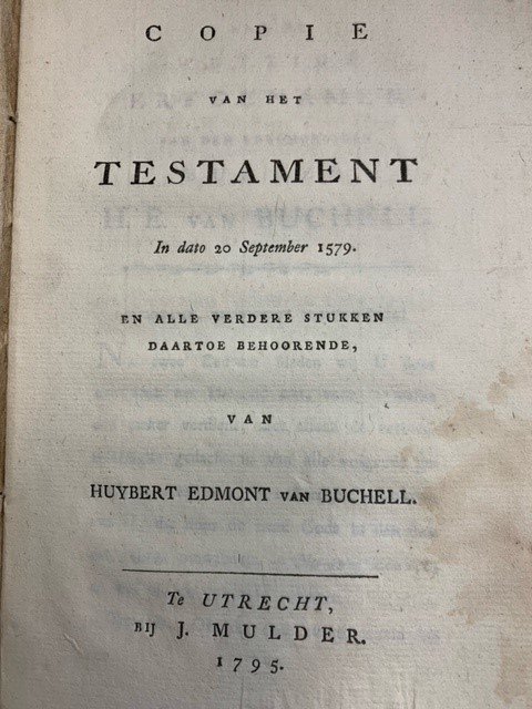 Copie van het Testament in dato 20 September 1579 en alle verdere stukken daartoe behoorende van Huybert Edmont van Buchell Utrecht, J. Mulder, 1795, 45pp, waterstain on titlepage and first few pages, contemporary paper softcover binding. Hubert van Buchell (also Van Buchel) (31 May 1513 - 28 May 1599) was a clergyman and philantropist in Utrecht. He contributed to the foundation of the city library of Utrecht and donated soms of money to the poor. This is his last will and testimony. Only three copies in STCN. Not in KB.