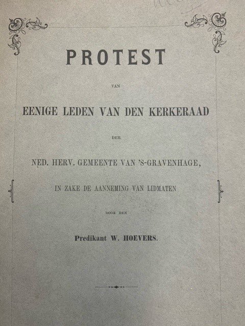 Protest van eenige leden van den Kerkeraad der Ned. Herv. Gemeente van 's-Gravenhage, in zake de aanneming van lidmaten door den predikant W. Hoevers 's-Gravenhage, H.J. Gerretsen, [1872] 34pp. original softcover paper binding, protest agianst clergyman Willem Hoevers (1827-1884) admitting W.M.H. Boers to the church, signed by Wassenaer van Catwijck, Bergh van Heemstede, Lijnden, Thierry, Roosmalen Nepveu, Hoogenraad, Smelik, Schouwenburg, Wijsman, Bergen Henegouwen, Lampe.