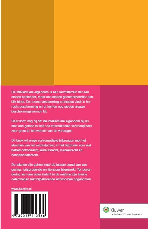 De intellectuele eigendom is een rechtsterrein dat een steeds boeiender, maar ook steeds gecompliceerder aanblik biedt. Een bonte verzameling prestaties vindt in het recht bescherming en er komen nog steeds nieuwe beschermingsvormen bij.Daar komt nog bij dat de intellectuele eigendom bij uitstek een gebied is waar de internationale verknooptheid zeer groot is; het wemelt van de verdragen.Dit boek wil enige vertrouwdheid bijbrengen met het stramien van het rechtsterrein, in het bijzonder voor wat betreft octrooirecht, auteursrecht, merkenrecht en handelsnaamrecht.De teksten zijn geheel naar de laatste stand van wetgeving, jurisprudentie en literatuur bijgewerkt. Ter bevordering van een beter inzicht in de materie zijn tevens oefenvragen met bijbehorende antwoorden opgenomen.