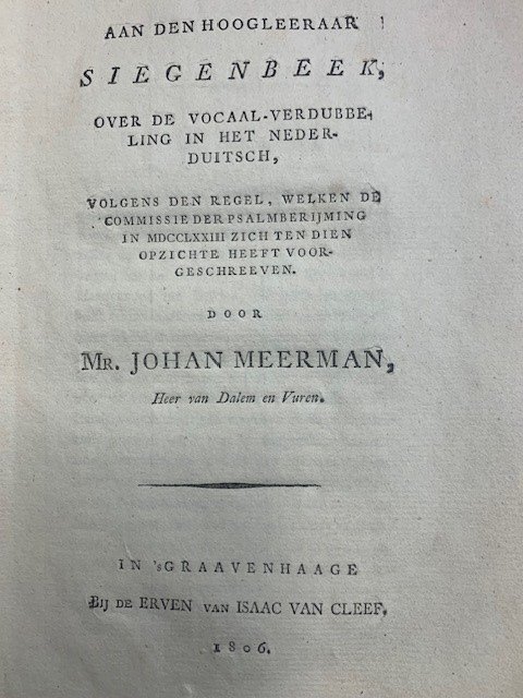 Aan den hoogleeraar Siegenbeek, over de Vocaal-verdubbeling in het Nederduitsch, volgens den regel welken de Commissie der Psalmberijming in 1773 zich ten dien opzichte heeft voorgeschreven / door Johan Meerman. 's Graavenhaage, Erven van Isaac van Cleef, 1806, 63pp. softcover speckled binding, Johan Meerman, heer van Dalem en Vuren (Den Haag, 1 November 1753 - 19 August 1815) who was a Dutch author, bookcollector and politician wrote this treatise as an address to Matthijs Siegenbeek (23 June 1774 in Amsterdam - 26 November 1854 in Leiden) who was a Dutch academic. From 1797 to 1847 he was the first professor of the Dutch language at the University of Leiden. From 1803 he was the member, then secretary, of the head-office of that university's literary faculty. Initially he was a Mennonite voorganger in Dokkum. Scarce.