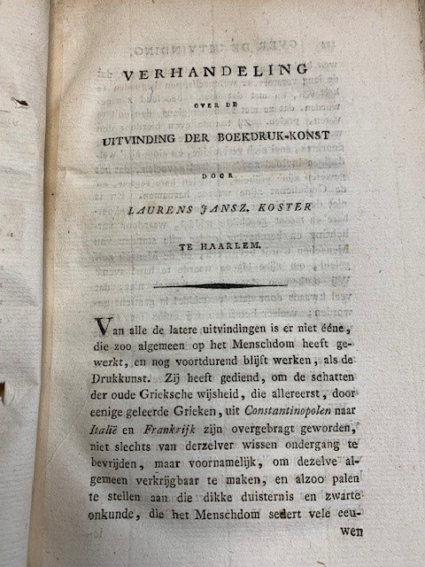 Proeve ter beantwoording van de vraag: Kan het aan Haarlem met eenigen grond betwist worden, dat de konst om met enkel verplaatsbare letters te drukken, aldaar voor het jaar 1440, door Laurens Koster is uitgedacht? En is niet deze konst van daar naar Mentz overgebragt, en aldaarverbeterd door letters van tin gegoten voor de houten letters in plaats te stellen? Verhandeling over de uitvinding der boekdruk-konst door Laurens Jansz. Koster te Haarlem. [1811-1839], no publisher, no place, 123-216pp. edges frayed, top of pages soiled and damaged, waterstaining throughout, marbled paper softcover binding, possibly written by Jacobus Koning (fl. 1811-1838). Scarce. Treatise on the invention of bookprinting.