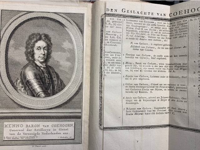 Portrait and Tafel van den Geslachte van Coehoornwith biographical notes. 18th century, engraved portrait by R. Keyert/C. Netscher/J. Houbraken, printed family tree of Coehoorn family, biograpical notes: 371-395pp. Loose from later hardcover binding. Extract from : Jan Wagenaar, Vaderlandsche historie, vervattende de geschiedenissen der nu Vereenigde Nederlanden, inzonderheid die van Holland (...), 21 delen. Amsterdam, Isaak Tirion, 1749-59.biography of Menno, Baron van Coehoorn (March 1641 - 17 March 1704) who was a Dutch soldier and engineer, regarded as one of the most significant figures in Dutch military history. In an era when siege warfare dominated military campaigns, he and his French counterpart Vauban were the acknowledged experts in designing, taking and defending fortifications.Both had their advocates; Vauban's maxim of 'more powder, less blood' also took longer, an important consideration when most military deaths occurred from disease. He is also viewed as more innovative in the design and extent of his fortifications, which included ports, waterways, roads and even town layouts. However, unlike Vauban, Van Coehoorn had limited financial resources. He showed great skill in maximising these, while adapting to the specific challenges posed by the flat terrain in the Netherlands. Some of his water defences and designs were still being used in the 1950s (wikipedia).