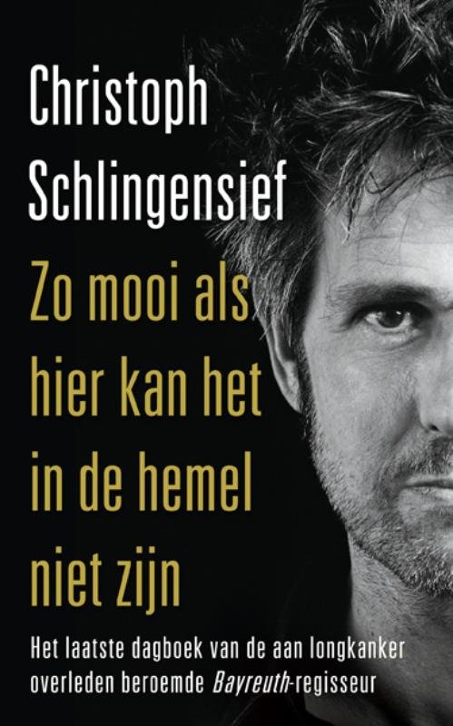 Christoph Schlingensief\nZo mooi als hier kan het in de hemel niet zijn\n\n‘Verbaasd kijk ik uit het raam. Het is alsof ik de zon en de wolken nog nooit heb gezien.’ Hoe kun je verder leven als de dood opeens nabij is? In januari 2008 wordt bij de bekende Duitse film-, theater- en operaregisseur, performance- en beeldend kunstenaar Christoph Schlingensief longkanker ontdekt. Hij wordt geopereerd en er volgen chemotherapie en bestraling: het lijkt een eindeloze nachtmerrie. Maar al een paar dagen na de diagnose begint Christoph Schlingensief te praten. Hij voert gesprekken met zichzelf, met vrienden, met zijn overleden vader en met God. Soms woedend en opstandig, soms verdrietig en wanhopig, maar altijd met ontroerende poëzie en warmte benadert hij de vragen waar zijn ziekte hem mee confronteert. Wie was je? Wat kun je nog worden? Hoe kun je blijven werken hoewel de wereld te snel voor je geworden is? Hoe leer je de ziekte te aanvaarden? Hoe kun je doodgaan mocht het er slecht voor komen te staan? En waar is God eigenlijk? Met zijn bewogen dagboek laat Christoph Schlingensief ons deelhebben aan zijn indringende zoektocht naar zichzelf, naar God en naar de liefde voor het leven. \n\nChristoph Schlingensief (1960-2010) studeerde filologie, filosofie en kunstgeschiedenis in München. Hij werd bij het grote publiek bekend met de Deutschlandtrilogie (1989-1992): 100 Jahre Adolf Hitler, Das deutsche Kettensägenmassaker en Terror 2000, en verder met African Twintowers. In de jaren negentig werd hij vaste regisseur bij de Berlijnse Volksbühne am Rosa-Luxemburg-Platz. Voor de Bayreuther Festspiele in 2004 ensceneerde hij zijn eerste opera, Parsifal. Daarnaast concentreerde hij zich steeds meer op de beeldende kunst. Eind augustus 2010 overleed Christoph Schlingensief aan longkanker.