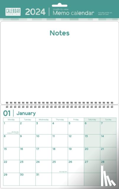 Flaptekst The Essential memo calendar 2024 has a simple month-to-view design. The calendar opens up into an A3 size display and has a handy write-on, wipe-off pen to help you organise your year. |