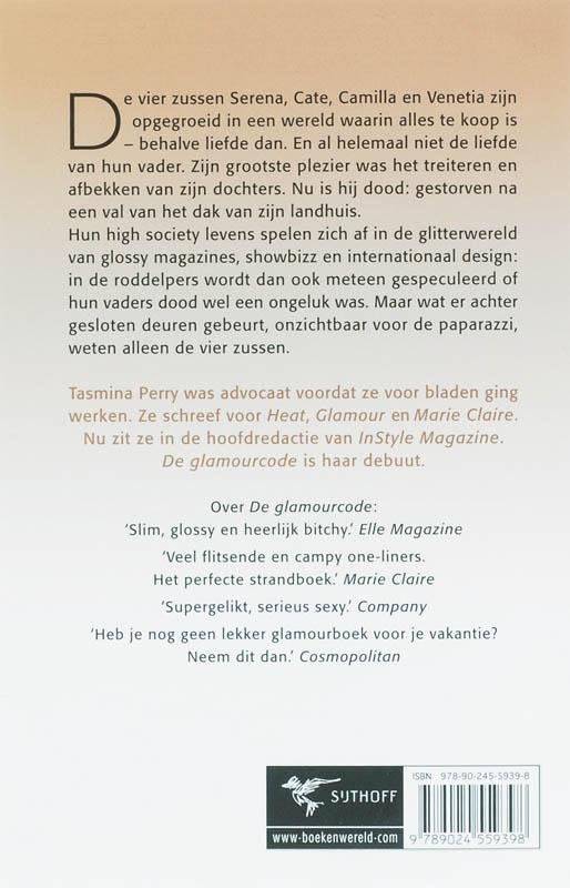 De vier zussen Serena, Cate, Camilla en Venetia zijn opgegroeid in een wereld waarin alles te koop is - behalve liefde dan. En al helemaal niet de liefde van hun vader. Zijn grootste plezier was het treiteren en afbekken van zijn dochters. Nu is hij dood: gestorven na een val van het dak van zijn landhuis.Hun high society levens spelen zich af in de glitterwereld van glossy magazines, showbizz en internationaal design: in de roddelpers wordt dan ook meteen gespeculeerd of hun vaders dood wel een ongeluk was. Maar wat er achter gesloten deuren gebeurt, onzichtbaar voor de paparazzi, weten alleen de vier zussen.Tasmina Perry was advocaat voordat ze voor bladen ging werken. Ze schreef voor Heat, Glamour en Marie Claire. Nu zit ze in de hoofdredactie van InStyle Magazine. De glamourcode is haar debuut.Over De glamourcode:Slim, glossy en heerlijk bitchy.' Elle MagazineVeel flitsende en campy one-liners. Het perfecte strandboek.' Marie ClaireSupergelikt, serieus sexy.' CompanyHeb je nog geen lekker glamourboek voor je vakantie? Neem dit dan.' Cosmopolitan