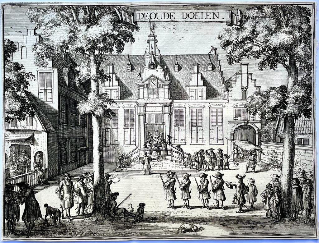 | Bijzonderheden: | View of the old military base in Haarlem, with many gunmen in the square in front of it. This sheet is part of an extensive print with a large map of Haarlem, surrounded by seven coats of arms, a profile of the city, views of prominent Haarlem bui... |
