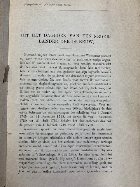 | Meer info: | Uit een dagboek van een Nederlander der 18e eeuw. Offprint from "De Gids" 1883, no 6. 22pp. blank paper softcover binding, treatise on the diaries of Johannes Wassenaar (1698-1767) written by SamueL Adrianus Naber (1828-1913). |