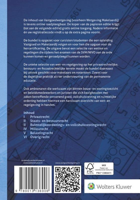 De inhoud van Vastgoedwetgeving is tevens online raadpleegbaar. De koper van de papieren editie krijgt (tot aan de volgende editie) gratis online toegang. De opgenomen wet- en regelgeving is afgestemd op het examen van de SVM/NIVO voor curisten/studenten die een opleiding Vastgoed en Makelaardij volgen en voor hen die opgaan voor de hercertificering. De unieke selectie van wet- en regelgeving op het privaatrechtelijke-, bestuurs- en fiscaalrechtelijke terrein maakt de bundel daarnaast bij uitstek geschikt voor makelaars en notarissen. Ook ambtenaren die werkzaam zijn binnen bouw- en woningtoezicht en beleidsmedewerkers en juristen die zich bezighouden met zaken betreffende onroerend goed, volkshuisvesting en ruimtelijke ordening hebben hiermee een handzaam overzicht van wet- en regelgeving in handen. De teksten zijn voorzien van margewoorden. Behalve de verkorte inhoudsopgave is er ook per deelgebied een uitgebreide inhoudsopgave. Als extra zoekingang is een uitgebreid trefwoordenregister en een uitvoerig alfabetisch inhoudsoverzicht opgenomen. Suggesties voor de auteurs/bewerkers mogen gestuurd worden aan mailto:docenten@wolterskluwer.com