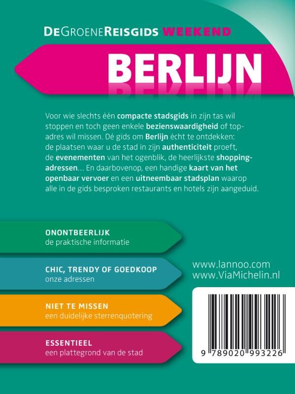 De 3-sterrengids voor een geslaagde citytrip De ideale gids voor wie slechts één compacte stadsgids in zijn tas wil stoppen en toch geen enkele bezienswaardigheid of topadres wil missen. Dé gids om Berlijn écht te ontdekken: de plaatsen waar u de stad in zijn authenticiteit proeft, de evenementen van het ogenblik, de heerlijkste shoppingadressen… En daarbovenop, een handige kaart van het openbaar vervoer en een uitneembaar stadsplan waarop alle in de gids besproken restaurants en hotels zijn aangeduid.