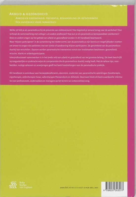 Welke rol heb je als paramedicus bij de preventie van ziekteverzuim? Hoe begeleid je iemand terug naar de werkvloer? Hoe kun je als paramedicus beroepsziekten voorkomen? Deze en andere vragen op het gebied van arbeid en gezondheid worden in dit handboek beantwoord. Met de talloze tips, voorbeelden, nuttige adressen en verwijzingen geeft dit handboek handreikingen voor de paramedische praktijk.