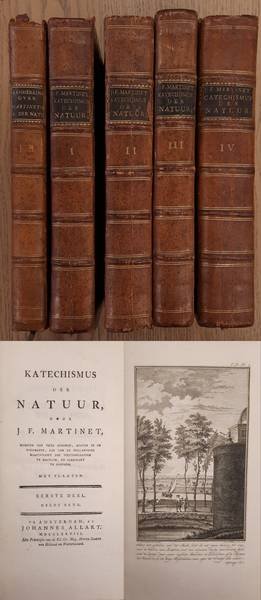 sommige platen handgekleurd en uitvouwbaar. Vier delen: XIII, 422 ; 426 ; 387 en 502 pag. + Bijvoegsels en Verbeteringen. Deel 1 op frontcover gevlekt; andere delen uitstekend. Al met al een KEURIGE SET * ** Toegevoegd: J. de VRIES, Natuurkundige en ophelderende aanmerkingen over het EERSTE en TWEEDE DEEL [in één band] van J.F.Martinet's Katechismus der natuur door J.De Vries. In leer gebonden. Amsterdam, Joannes van Selm, 1779 ; XIV, 198 pag.