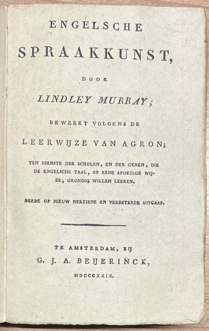 | Titel: | Schoolbook, 1829, English | Engelsche Spraakkunst, door Lindley Murray; bewerkt volgens de Leerwijze van Agon (...) Te Amsterdam, bij G. J. A. Beijerinck, 1829, 316 pp. |