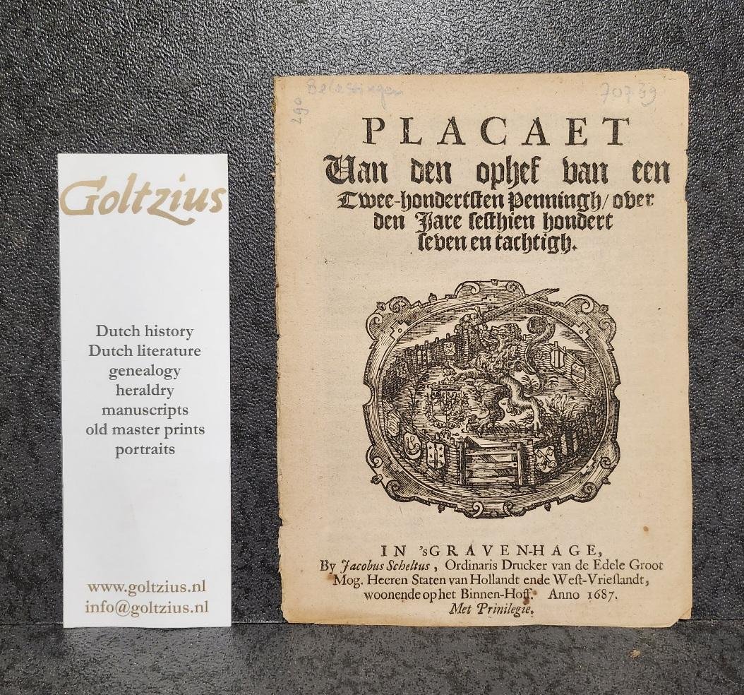 Placaet van den ophef van een twee-hondertsten penningh over den Jare sestien hondert seven en tachtigh. The Hague, Ordinaris Drucker ven den Edele Groot Mog. Heeren Staten van Hollandt ende West-Vrieslandt, woonende op het Binnen-Hoff, 1687, two folded sheets, without binding, 8 pp., gothic font, woodcut printer's mark on titlepage depicting the Dutch heraldic lion. Official statement explaining why, in the face of war, extra taxes are neccessary and how they will be implemented. With underlined sections.
