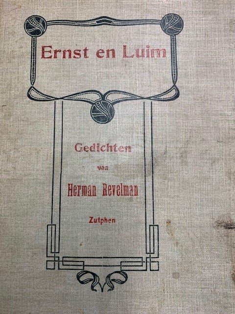 | Meer info: | Ernst en Luim. Gedichten van Herman Revelman. Zutphen, W.C. Wansleven, [1907], 54pp. original linen illustrated (art deco) binding (some waterdamage to front), |