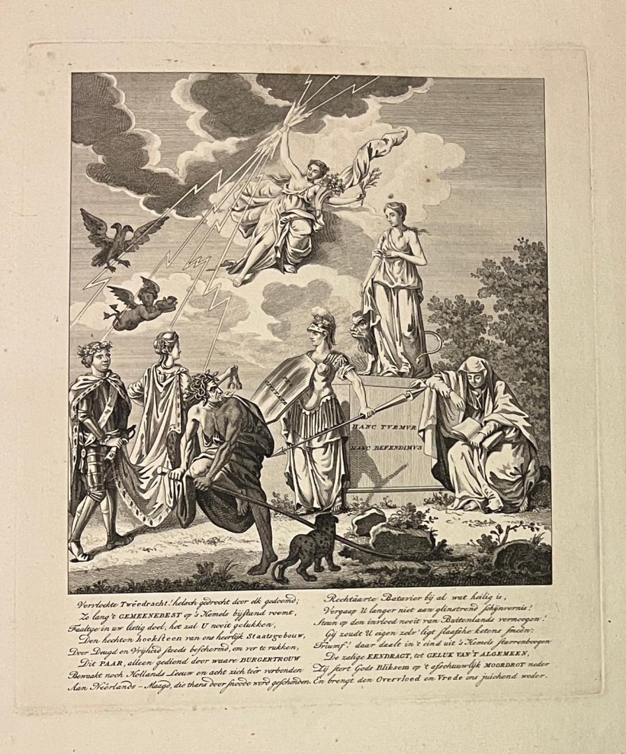 | Bijzonderheden: | Patriotic allegory on the attempts of Stadtholder William V (1748-1806) to restore his power, 1787. The Dutch Virgin and Lion standing on the cornerstone of the State Building that Tweedracht tries in vain to overthrow. Freedom protects the state ... |