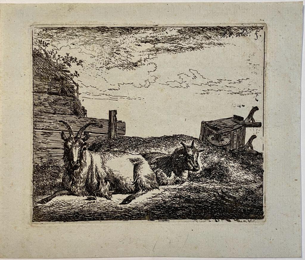 | Titel: | Antique print, etching | Recumbent goats (liggende geiten door Adriaen van de Velde), published ca. 1657, 1 p. |