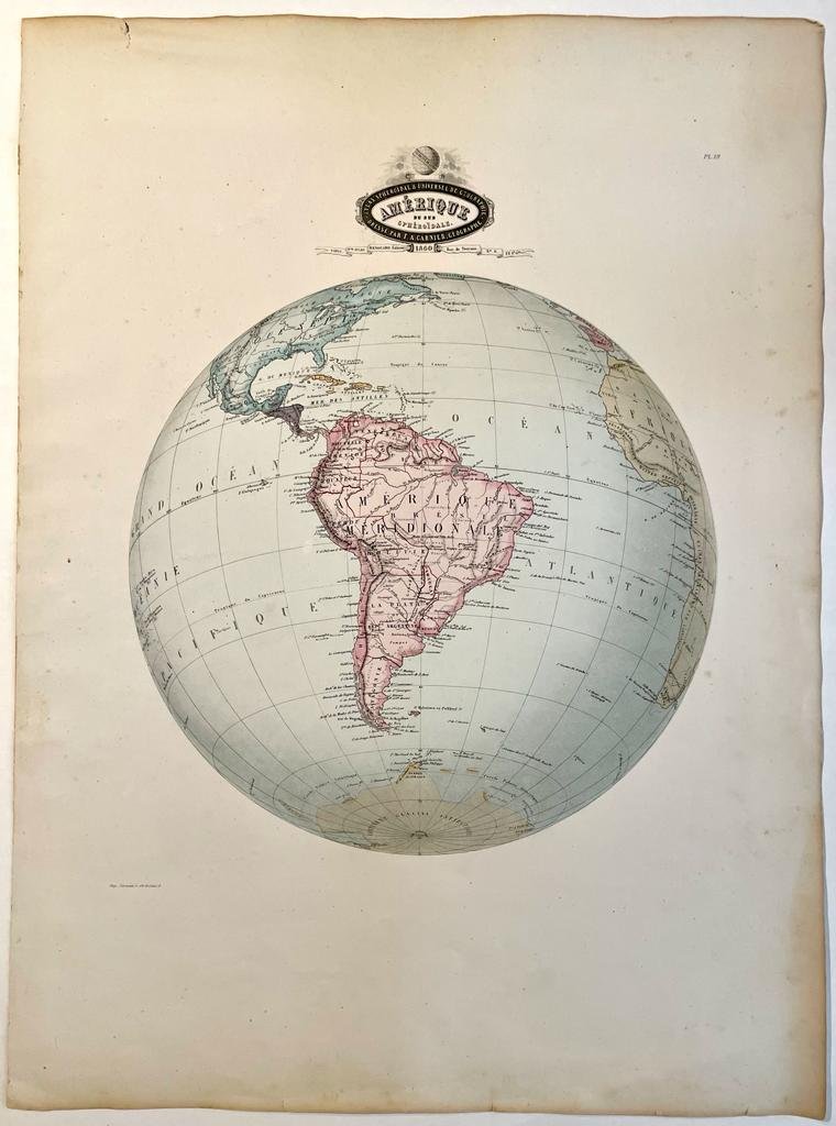 | Bijzonderheden: | Map of Southern America, including the South Pole, a view of part of Africa and North America. Titled in vignette: Amerique du Sud Spheroidale.Indications of mountains and rivers. Map included in Atlas Spheroidal et Universel de Geographie by M.F.... |