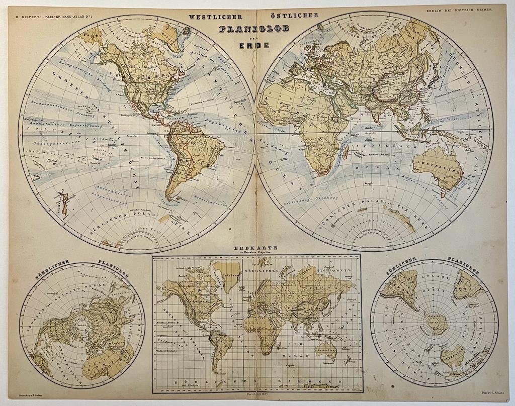 | Bijzonderheden: | Antique map titled 'Planiglob der Erde'. Old map of the world. This map originates from H. Kiepert's 'Kleiner Atlas der Neueren Geographie für Schule und Haus'.Heinrich Kiepert (1818-1899), was a German geographer, and the son of a wealthy busine... |