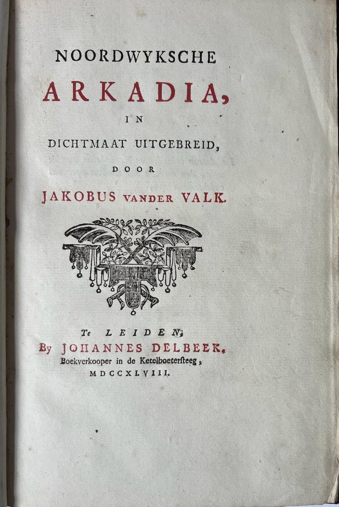 | Titel: | Rare first edition topographical poetry on Noordwijk 1748 | Noordwyksche arkadia, in dichtmaat uitgebreid door Jakobus vander Valk, Leiden, Johannes Delbeek, boekverkoper in de Ketelboetersteeg 1748, 96 pp. |