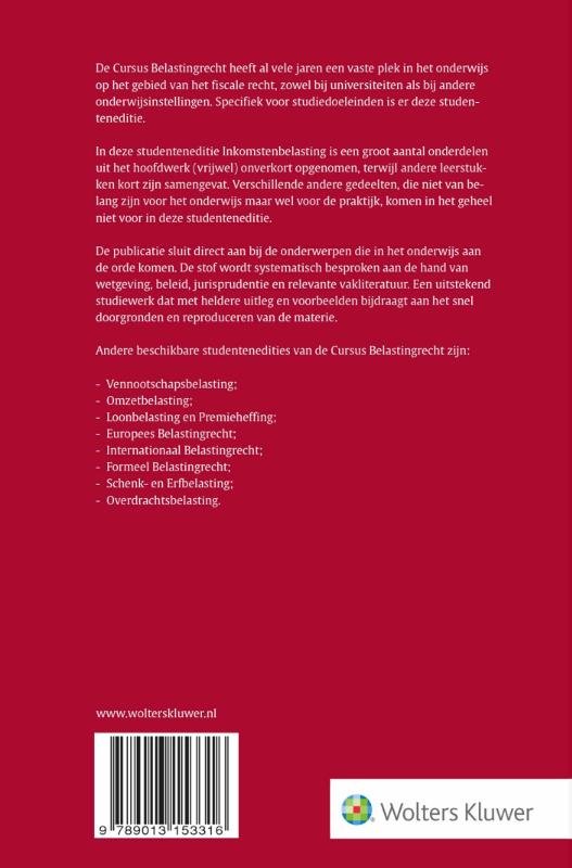 Dit studieboek biedt jou een compleet en behapbaar overzicht van het belastingrecht over inkomstenbelasting. Verhelderd met wetgeving, beleid, jurisprudentie en vakliteratuur. Én geschreven door topauteurs uit wetenschap en praktijk. Studenteneditie Cursus Belastingrecht Inkomstenbelasting geeft je een leesbare toelichting op de Wet Inkomstenbelasting 2001, voorzien van wetgeving, beleid, jurisprudentie en vakliteratuur. Uiteraard is alles geheel geactualiseerd naar de laatste wet- en regelgeving. Zo vind je in deze studenteneditie ook de actuele stand van zaken over winstbegrip, de eigenwoningregeling, aanmerkelijk belang en de vermogensrendementsheffing. De inhoud is systematisch geordend. Je hoeft niet artikelsgewijs door de stof te ploeteren, maar vindt alles helder terug in samenhangende thema#s. De stof wordt verlevendigd met voorbeelden uit de toepassingspraktijk. Het helpt je de wetgeving en ontwikkelingen op het gebied van inkomstenbelasting snel eigen te maken. Deze studenteneditie is speciaal geschreven voor het universitaire fiscale onderwijs. De inhoud is tot stand gekomen in overleg met docenten van de universitaire fiscale vakgroepen, zodat het boek naadloos aansluit op jouw studie.