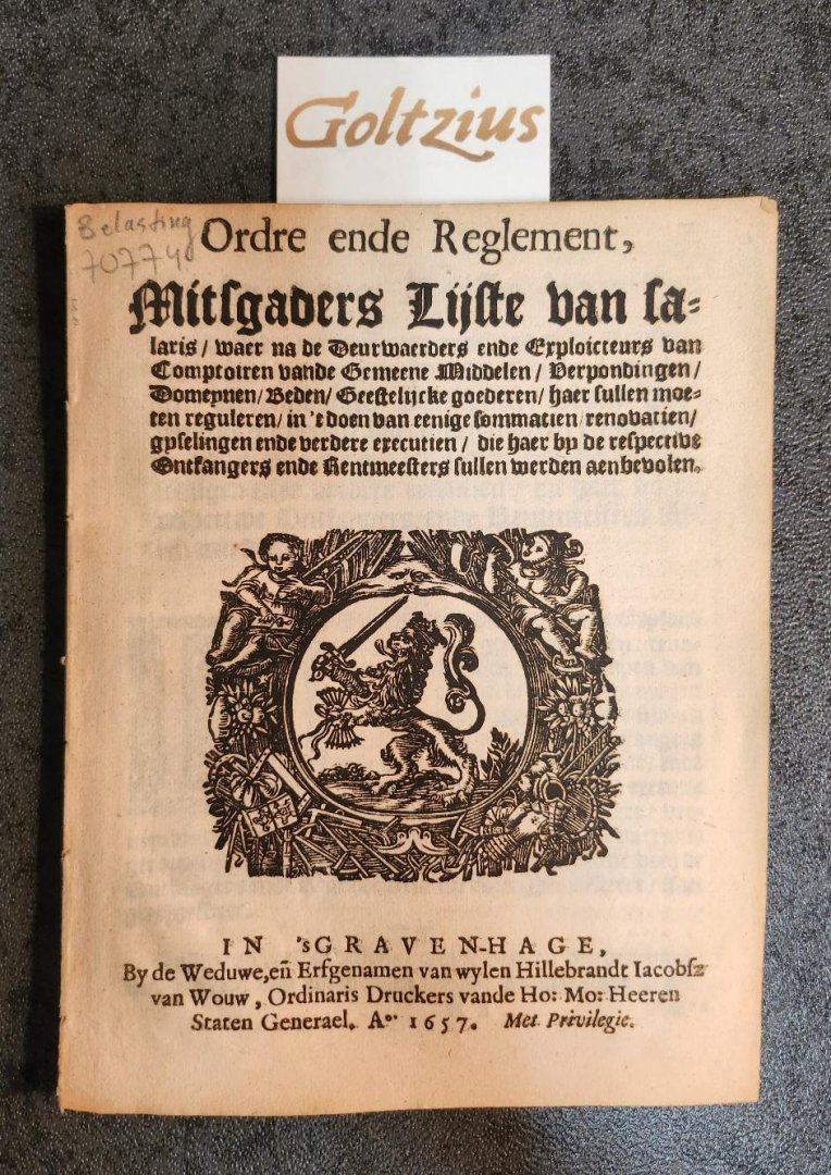 Missive van Parnas, vervattende onder andere, een redenering van Ferdinand Alvares van Toledo, Hartog van Alva. En Apolloos oordeel over de selve. Without place or printer, 1684, 4to. 8 pp., paper binding with handwritten title shield on the front, some damage to the titlepage and a small ink stain on the first page (all without text loss), with a lovely woodcut vignet on the titlepage, Knuttel 12178.