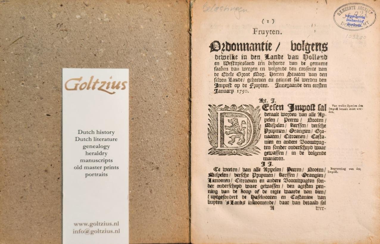 Fruyten. Ordonnantie volgens dewelke in den Lande van Holland en Westvriesland ten behoeve van de gemeene saaken van weegen en volgende den consente van de Edele Groot Mog. Heeren Staaten van den den selven Lande geheeven en geinnet sal werden den Impost op de Fruyten. Innegaande den eersten January 1750. [The Hague, Jacobus Scheltus], 1749, 4to. two copies sewn into a blue paper and board cover, 2x 8 pp., cover is damaged along the spine, some sign of worming and a visible repair to the second copy. With a library stamp (Gemeente Archief Dordrecht). An official statement concerning taxes on fruit.