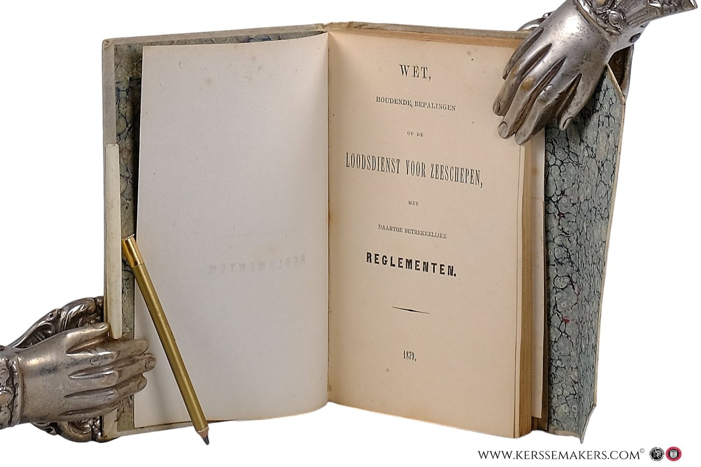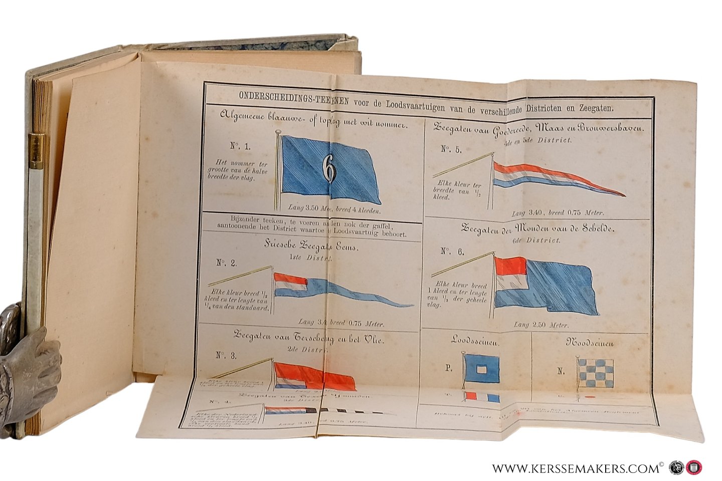 marbled endpapers. With the original small pencil in cylinder case of vellum. 82 and 18 pp. with 'Modellen' , 'Certificaten ' & 'Tarieven' in text and folding plate (22x22 cm) with 10 (in 8 sections) "Onderscheidings-teekenen voor de Loodsvaartuigen van de verschillende Districten en Zeegaten": flags and standards coloured by hand. - Spots on vellum, a few inkspots and some annotations in text and on last fly-leaf, but on the whole an attractive copy of a handy utensil in pocket size. Extremely rare edition of "Wet van 1859 na de wijzigingen van 1875 en Februarij 1879".