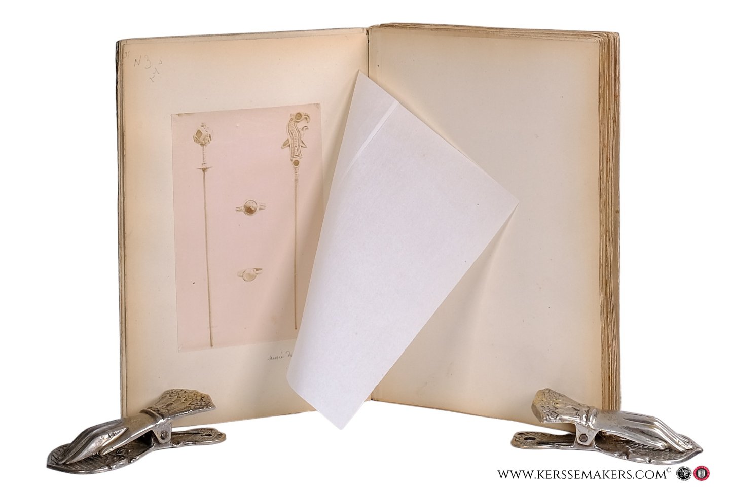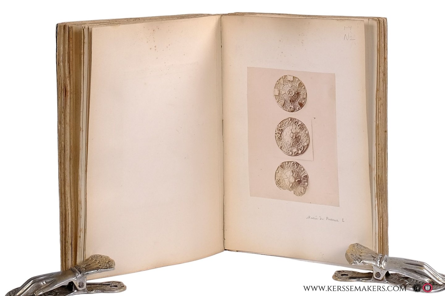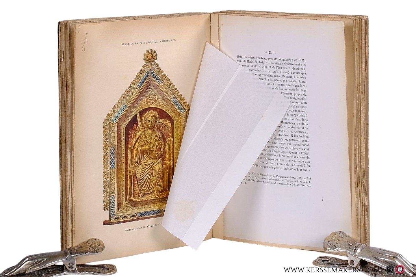 spine loosening and some imperf.), uncut. 166, (iv) pp. (brown spots in places). - Extra illustrated copy: the tabel mentions 27 images: 11 plates and 16 photographs. Our copy with 33 photographs (11 in colours) pasted in on cardboard and 17 engraved plates (10 in colours). The owner added the images with written letterpresses and made underlinings in pencil in text. Photographs and plates of ornements (4, Musée de Namur), numerous relic shrines (Visé, Dinant, Stavelot, Maestricht, Huy),and lacework, 2 laceworkers of Arras and several pieces of liturgical applied art. - The many sheets of cardboard with the mounted photographs cause deformation of the spine but still an acceptable and unique copy