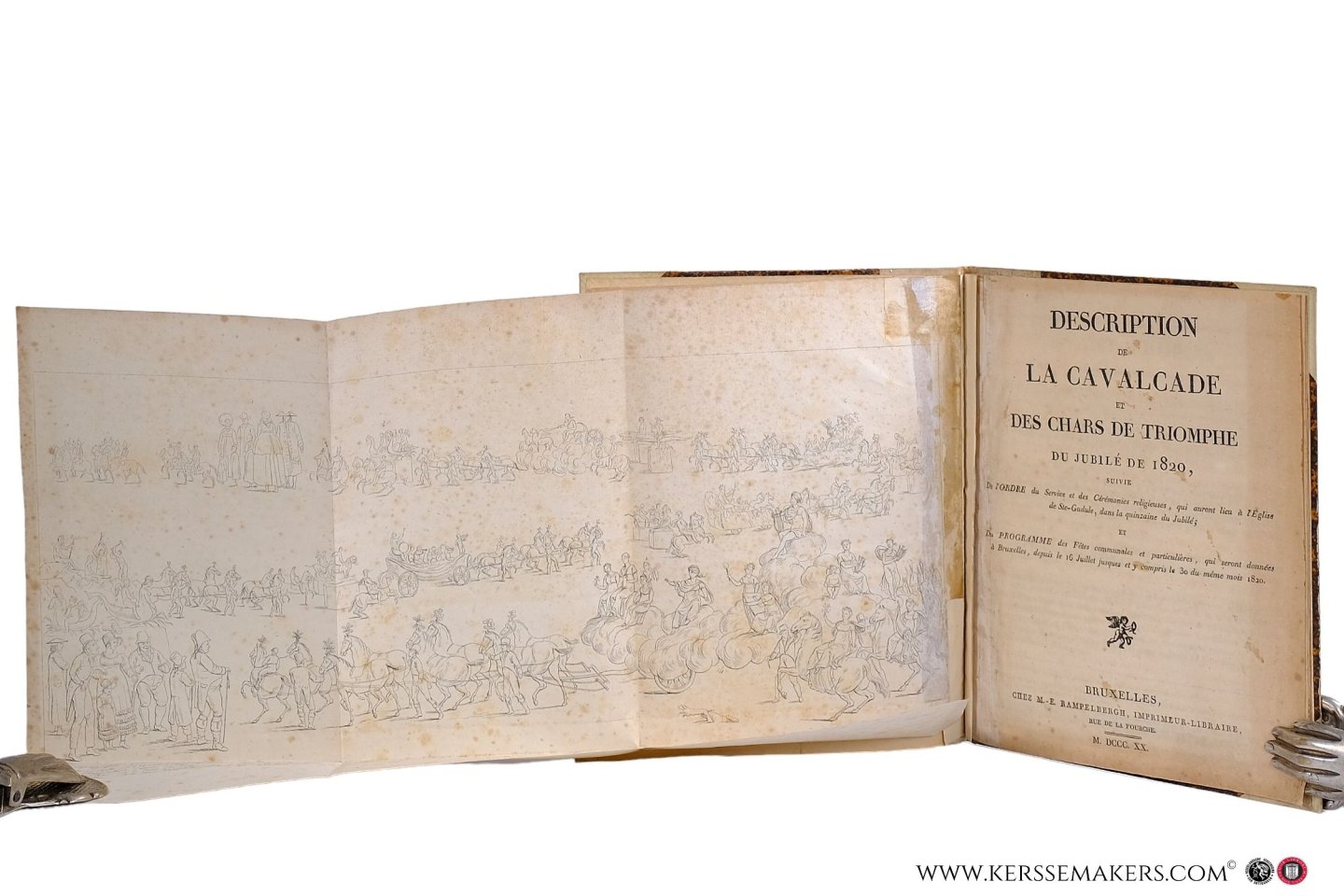 covers with decorated paper. (ii: Title), (ii: 'Avant-Propos'), (ii: 'Description de la cavalcade'), (iv: 'Régence de la ville de Bruxelles', printed in 2 columns (paper browned)). - Together 5 leaves with folding frontispiece of the 'cavalcade' (28x50 cm) lithography with explanatory lithographed text by G. P. vanden Burggraaf. Inner margins renewed with stiff paper; paper age-toned, frontispiece with brown spots and small strip of the picture along margin discolored (by glue?). - Very rare. See WorldCat: Only the lithography after C. Coine is available at Allard Pierson Depot, Amsterdam.