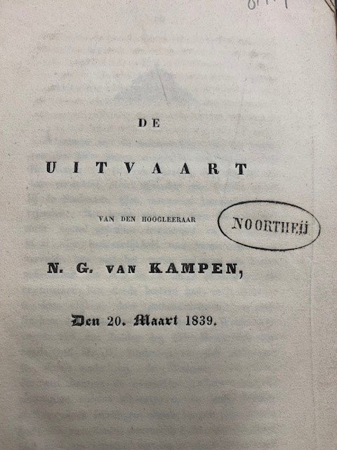 De uitvaart van den hoogleeraar N.G. van Kampen den 20.Maart 1839. [no publisher, place or date], 1839, 19pp. stamp of Noortheij on titlepage, original black paper softcover binding, obituary of Nicolaas Godfried van Kampen (15 May 1776, Haarlem - 15 March 1839, Amsterdam) who was a Dutch Mennonite author and deacon. While never university educated, he studied literature and history and published a large number of writings, including a history of the French domination of Europe (1810-1823, eight volumes). In 1829 he was called to teach Dutch literature and history at the Athenaeum (university) of Amsterdam. During his time in Leiden he was a deacon of the Mennonite congregation (1812-1815, 1818-1819, 1821-1829).