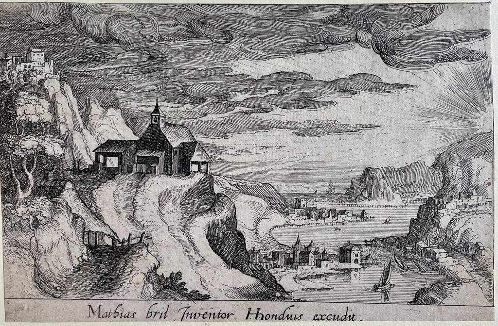 | Titel: | Antique print, etching | Landscape with a river valley on right and church on a hill on the left, published 1614, 1 p. |