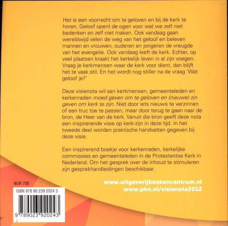 Het is een voorrecht om te geloven en bij de kerk te horen. Geloof opent de ogen voor wat we zelf niet bedenken en zelf niet maken. Ook vandaag gaan wereldwijd velen de weg van het geloof en beleven mannen en vrouwen, ouderen en jongeren de vreugde van het evangelie. Ook vandaag leeft de kerk. Echter, op veel plaatsen kraakt het kerkelijk leven in al zijn voegen. Vraag je kerkmensen waar de kerk voor dient, dan blijft het te vaak stil. En het wordt nog stiller na de vraag 'Wat geloof je?'Deze visienota wil aan kerkmensen, gemeenteleden en kerkenraden moed geven om te geloven en (nieuwe) zin geven om kerk te zijn. Niet door iets nieuws te verzinnen of een truc toe te passen, maar door terug te gaan naar de bron, de Heer van de kerk. Vanuit die bron geeft deze nota een inspirerende visie op kerk-zijn in deze tijd. In het tweede deel worden praktische handvatten gegeven bij deze visie.Een inspirerend boekje voor kerkenraden, kerkelijke commissies en gemeenteleden in de Protestantse Kerk in Nederland. Om het gesprek over de inhoud te stimuleren zijn gesprekhandleidingen beschikbaar.