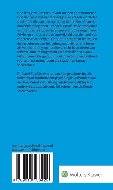 Hoe lees je vakliteratuur voor toetsen en tentamens? Hoe deel je je tijd in? Met dergelijke vragen worstelen studenten die aan een opleiding in het hbo of aan de universiteit beginnen. Dit boek signaleert de problemen van juridische studenten, en geeft er oplossingen voor. Adviezen en tips worden ontwikkeld aan de hand van concrete voorbeelden. De auteur bespreekt leerstijlen, de verbetering van het geheugen, oriënterend lezen als voorbereiding op het doelgericht bestuderen van teksten, time management en het maken van aantekeningen. Ook geeft dit boek inzicht in verschillende soorten tentamenvragen die studenten kunnen verwachten.