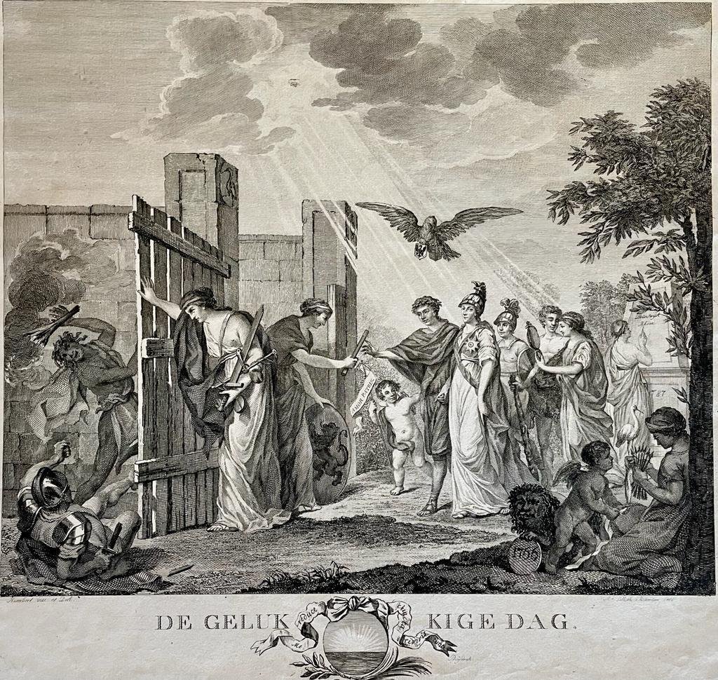 | Titel: | Antique print, engraving | De Gelukkige dag, published 1788, 1 p. |