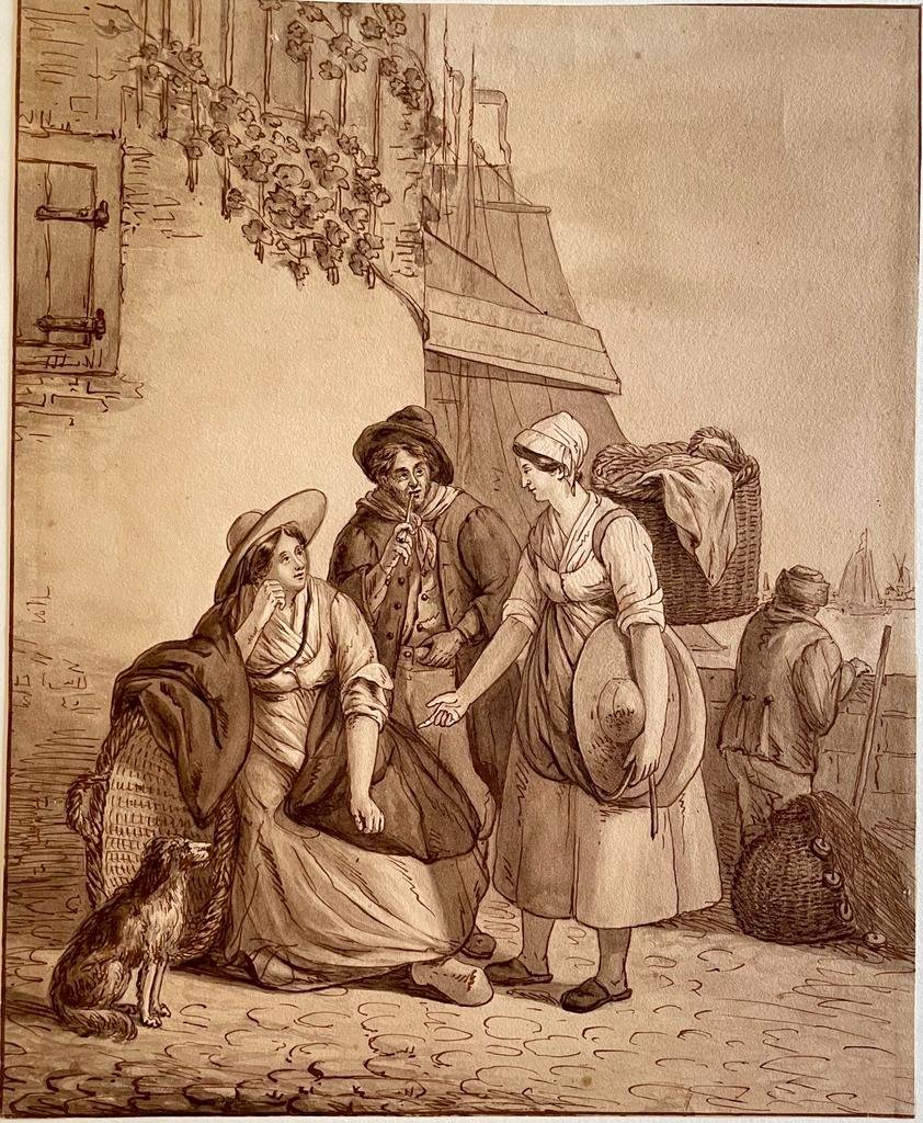 anonymous - Antique drawing | Peasants conversing by a harbour,