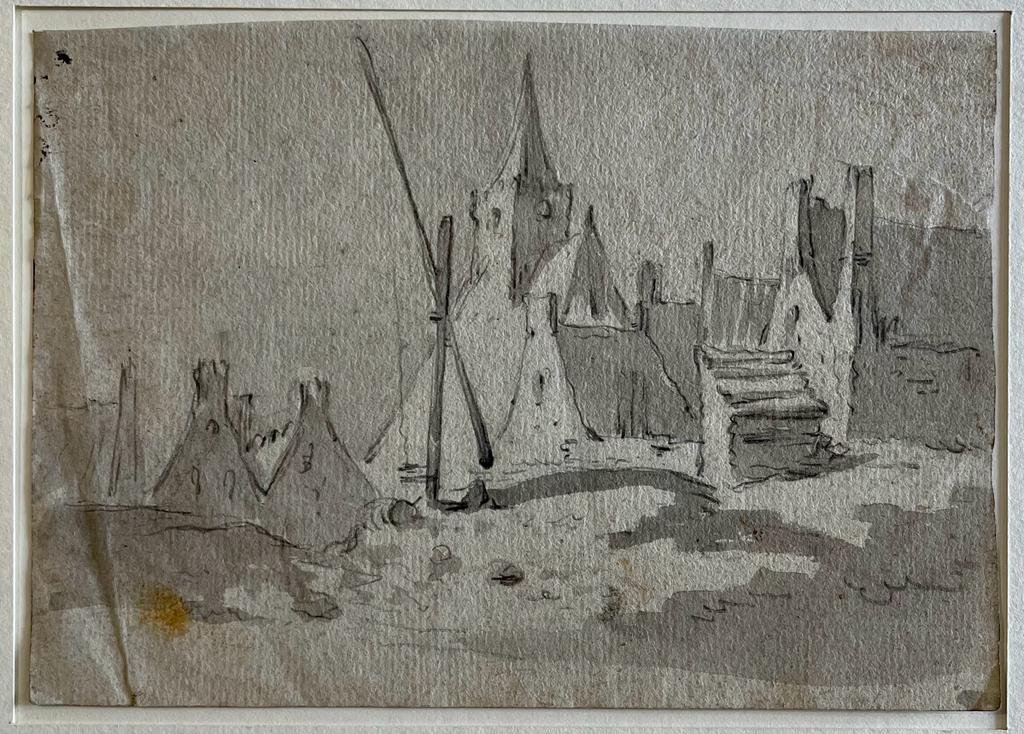 | Titel: | Antique drawing | View on houses and a church beyond a dune, ca. 1790, 1 p. |