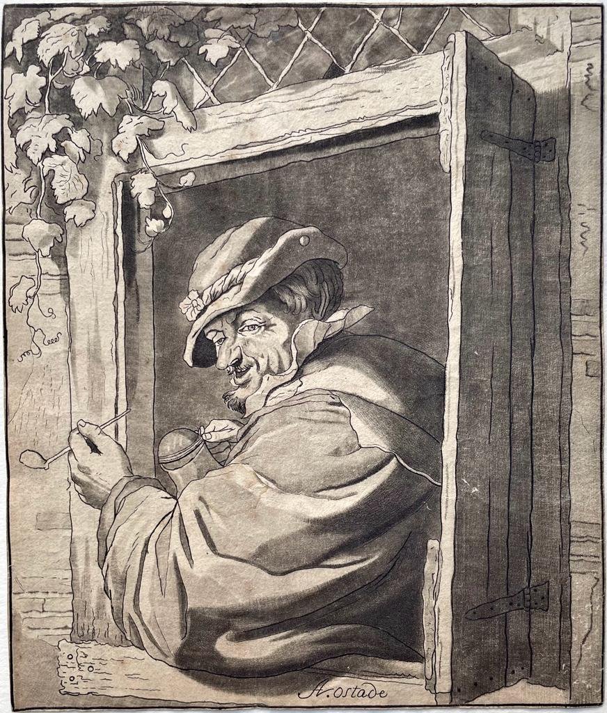 | Bijzonderheden: | Man (a farmer?) leaning out of a window holding a pipe in his left hand and a jug in the other. He wears a cap.After a print by Ostade (see Rijksmuseum inv. RP-P-1885-A-9048).Signed at bottom: AV. Ostade.Etching and roulette in Ploos van Amstel's ... |