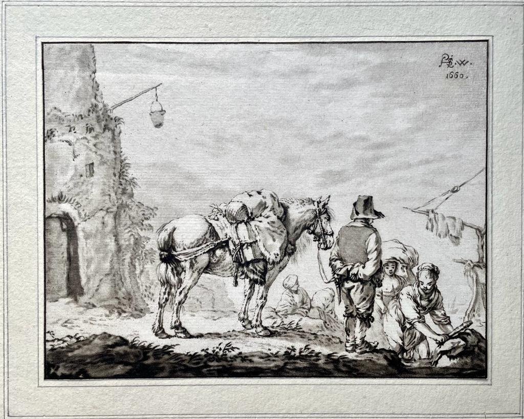 | Bijzonderheden: | A man holds the reins of his horse as he stands by a woman doing the laundry. She is knee-deep in water.Monogrammed and dated on the top right corner: PHW 1660.On verso the mark of Ploos van Amstel.Etching and roulette in Ploos van Amstel's techni... |