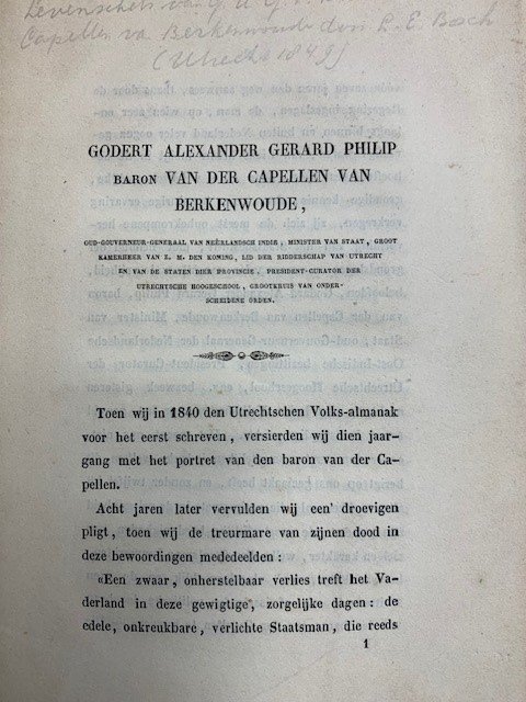 Godert Alexander Gerard Philip Baron van der Capellen van Berkenwoude. [1849], 100pp. only original softcover back of original binding remains, no spine, block loose. Godert Alexander Gerard Philip, Baron van der Capellen (Utrecht, 15 December 1778 - De Bilt, 10 April 1848) was a Dutch statesman. He held several important posts under the Kingdom of Holland and the Sovereign Principality of the United Netherlands, before he was appointed as one of the Commissioners-General of the Dutch East Indies. Later he was appointed Governor-General of that region.