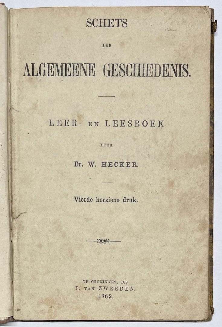 | Titel: | Schoolbook, 1862, Education | Schets der Algemeene Geschiedenis. Leer- en Leesboek door Dr. W. Hecker. Vierde herziene druk. Te Groningen, bij P. van Zweeden, 1862, 111 pp. |