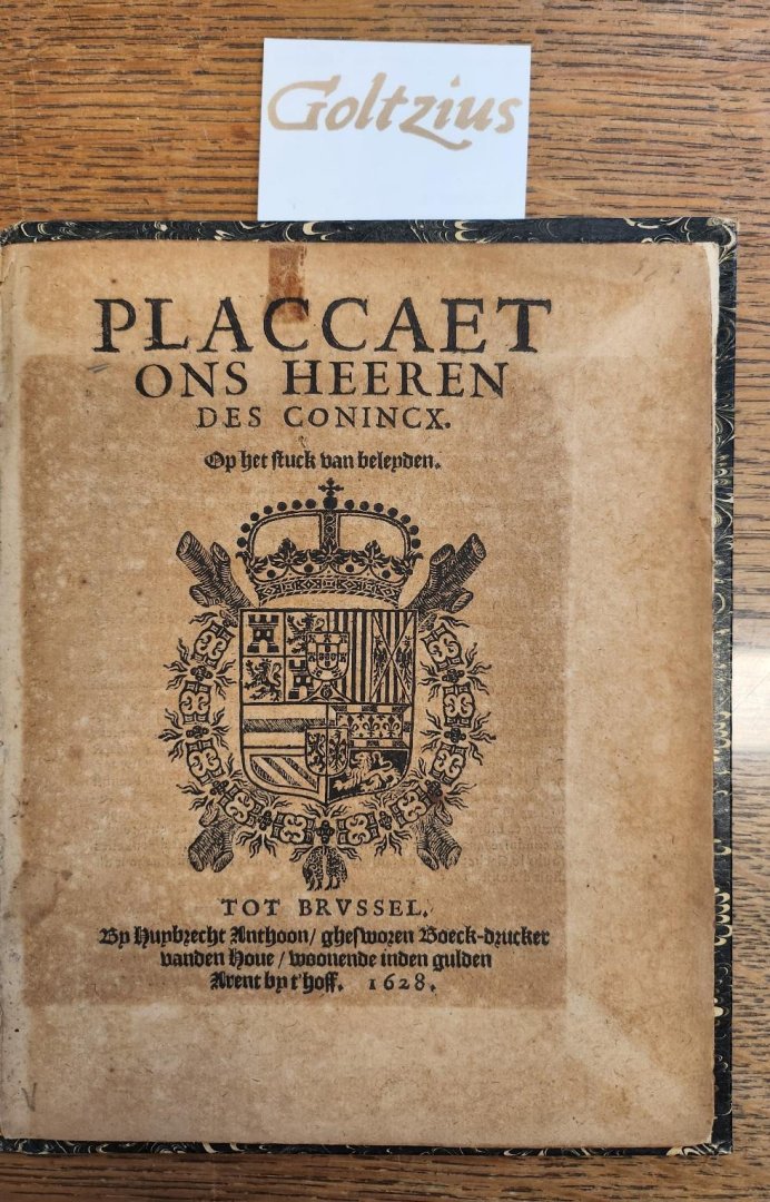 Placcaet ons heeren des conincx. Op het stuck van beleyden. Brussel, Huybrecht Anthoon, 1628, 4to., bound in marbled paper binding, 12 pp., worn along the spine, browned paper, some tears (one with a tape repair) and stains, with a printer's mark on the title page and a decorative initial, printed in a Gothic font. Concerns traffic and maintaining roads, bridges and waterwaysin Brabant.