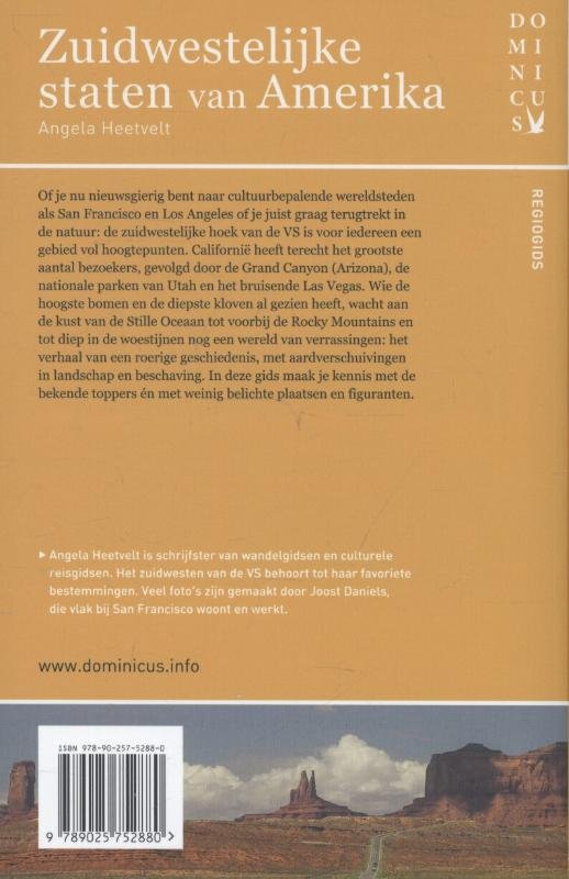 Dominicus Reisgidsen zijn gidsen voor avontuurlijke en geïnteresseerde mensen. Met extra aandacht voor geschiedenis en cultuur van het land, geschreven door Nederlandse auteurs, meer dan 75 bijzondere bestemmingen.Of het nu om een avontuurlijke reis gaat, om een lekkere vakantie of om een korte stedentrip: met Dominicus reis je verder en mis je niets...De Amerikaanse western heeft als genre zijn langste tijd misschien gehad, het decor van deze films ligt er nog altijd even adembenemend bij. Spectaculair zijn de rotsformaties en de diepe canyons van de staten Arizona en Utah, met de Grand Canyon, Arches en Bryce National Park als beroemde hoogtepunten. Maar ook de natuurgebieden van Californië - met een 1250 kilometer lange kustlijn langs de Stille Oceaan- en het kleurrijke woestijnlandschap van Nevada zijn groots en afwisselend.San Francisco is dé bestemming voor een fantastische stedentrip: fietsen over de Golden Gate Bridge en de wijken lopend of met historische trams ontdekken. Los Angeles is nog altijd het centrum van de filmindustrie; een bezoek aan een studio is vermaak van de hoogste orde. Een aanzienlijk deel van het grote geld rolde er naar wereldberoemde kunstcollecties. Broadwayshows zie je bij uitstek in Las Vegas: ook een reisdoel voor wie niets te winnen of te verliezen heeft ... Om nog meer variatie in een rondreis aan te kunnen brengen, beschrijven we in de nieuwe gids Zuidwestelijke Staten van Amerika ook het cultuurrijke New Mexico, met pueblodorpen en kunstenaarskolonies, en het veelzijdig 'natuurlijke' Colorado, waar hoofdstad Denver inmiddels veel meer is dan een cowboystad. Dit zijn slechts een paar van de redenen waarom het reizen door deze vier staten zo fascinerend is.In deze gids staan gedetailleerde informatie en achtergronden over bezienswaardigheden: nationale parken, attracties, evenementen, maar ook geschiedenis, flora en fauna. Kaarten en plattegronden maken de gids een uitstekende begeleider voor wie het gebied per auto of camper doorkruist.