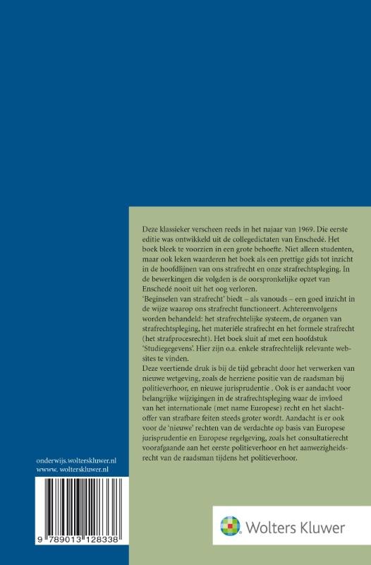 Beginselen van strafrecht biedt al sinds de eerste uitgave uit 1969 een goed inzicht in de wijze waarop ons strafrecht functioneert. In deze nieuwe druk is alle nieuwe wetgeving opgenomen, zoals de herziene positie van de raadsman bij politieverhoor en nieuwe jurisprudentie. Ook wordt aandacht besteed aan de invloed van het internationale recht en voor #nieuwe# rechten van de verdachte op basis van Europese jurisprudentie en regelgeving. Denk daarbij aan het consultatierecht voorafgaand aan het eerste politieverhoor en aan het aanwezigheidsrecht van de raadsman tijdens het politieverhoor. Achtereenvolgens worden behandeld: · het strafrechtelijke systeem · de organen van strafrechtspleging · het materiële strafrecht · het formele strafrecht (het strafprocesrecht) · #studiegegevens# met enkele strafrechtelijk relevante websites