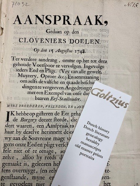Aanspraak, Gedaan op den Cloveniers Doelen. Op den 15 Augustus 1748. Ter verdere aandrang, omme op het tot deez gehoude voetspoor te vervolgen (...) Amsterdam, Matthys van Bemmel, 1748, 4pp. no binding, fold torn, edges frayed, 31x20cm. Pamphlet written in the unruly year 1748 when Dutch citizens turned against the elite and demanded fairer taxation and more help from stadhouder Willem IV. Scarce.