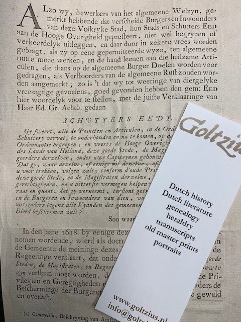 Alzo wij, bewerkers van het algemeene Welzyn, (...) Schutters Eedt [Amsterdam, 1748], one printed page, 29x19cm. Pamphlet written in the unruly year 1748 when Dutch citizens turned against the elite and demanded fairer taxation and more help from stadhouder Willem IV. this pamphlet notes that the "schutters" should protect the people in stead of shooting at them as was ordained in 1618 in their oath. Scarce.